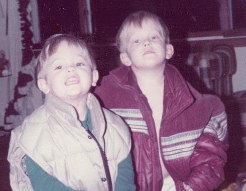 Justin and brother, trying to fit into Dad's jackets.